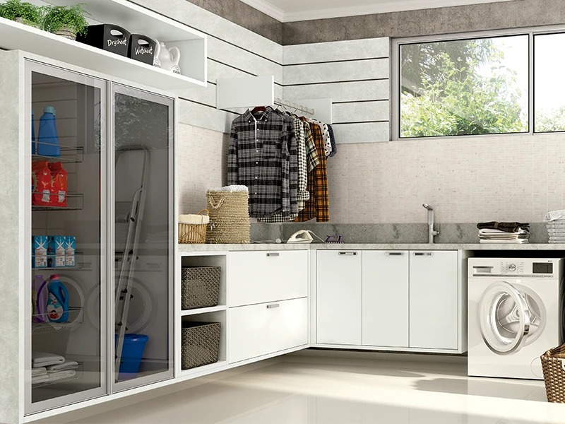 Além de verticalizar a organização, mantém os produtos “escondidos”, deixando-os fora do alcance de crianças e animais de estimação. Como a área de serviço geralmente é um lugar pequeno, quanto menos coisas pelo chão houver, melhor. Instale ganchos na parede ou em armários altos para pendurar vassouras, rodos e pás – alguns planejados possuem espaço reservado para esses utensílios.