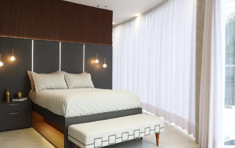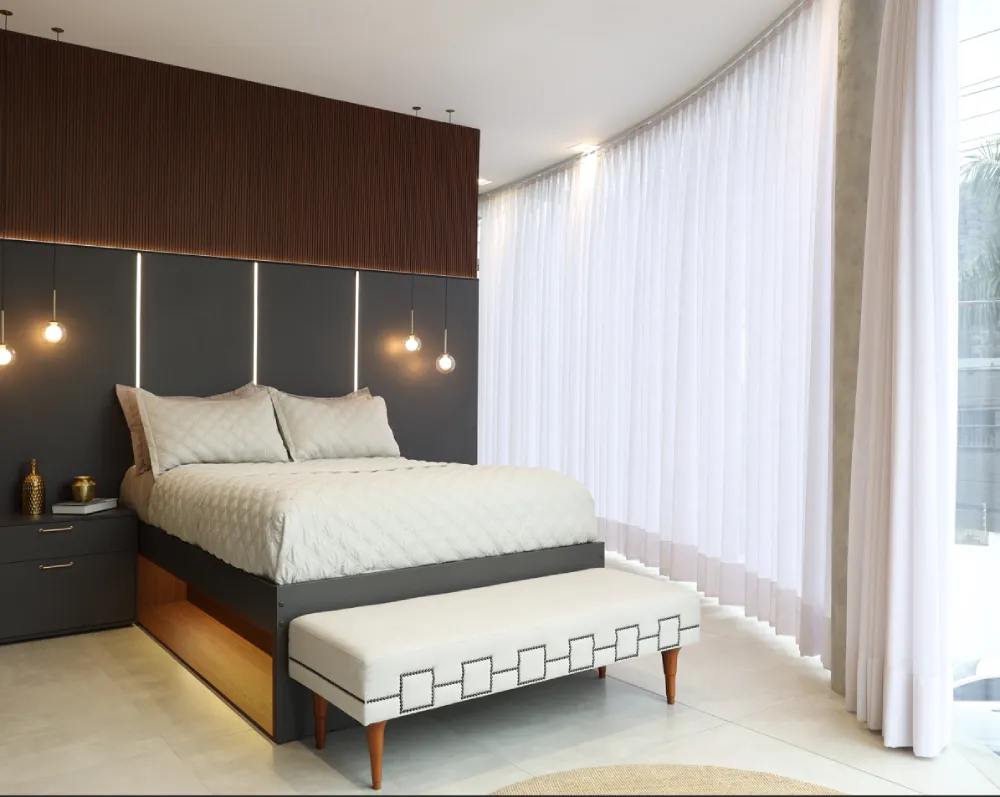Cortinas ou persianas ajudam a controlar a entrada de luz no dormitório e garantir a privacidade. Além disso, podem adicionar um toque de estilo ao ambiente. Opte por materiais que complementem a decoração do seu espaço.